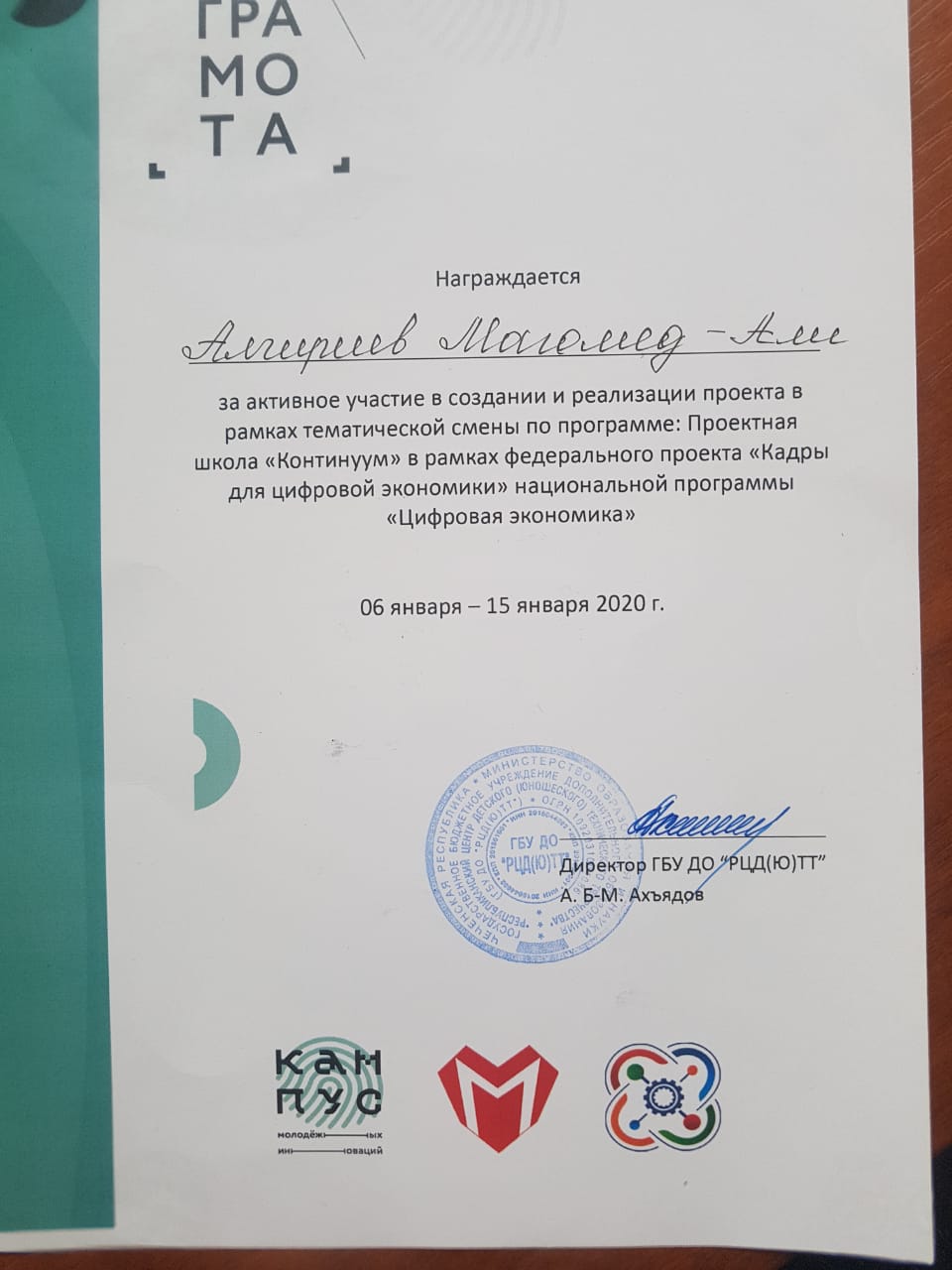 Ученик 9 «Б» класса Алгериев Магомед-Али награжден грамотой за активное участие в мероприятиях в рамках проекта «Кадры для цифровой экономики» национальной программы Цифровая экономика»