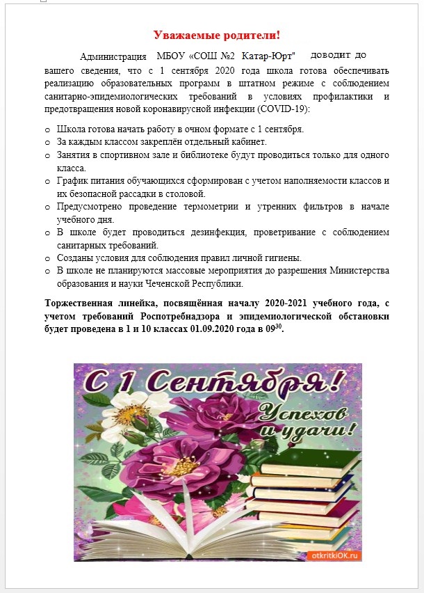 28.08.2020Администрация МБОУ «СОШ №2 с. Катар-Юрт» доводит до вашего сведения, что с 1 сентября 2020 года школа готова обеспечивать реализацию образовательных программ в штатном режиме с соблюдением санитарно-эпидемиологических требований в условиях профилактики и предотвращения новой коронавирусной инфекции (COVID-19).