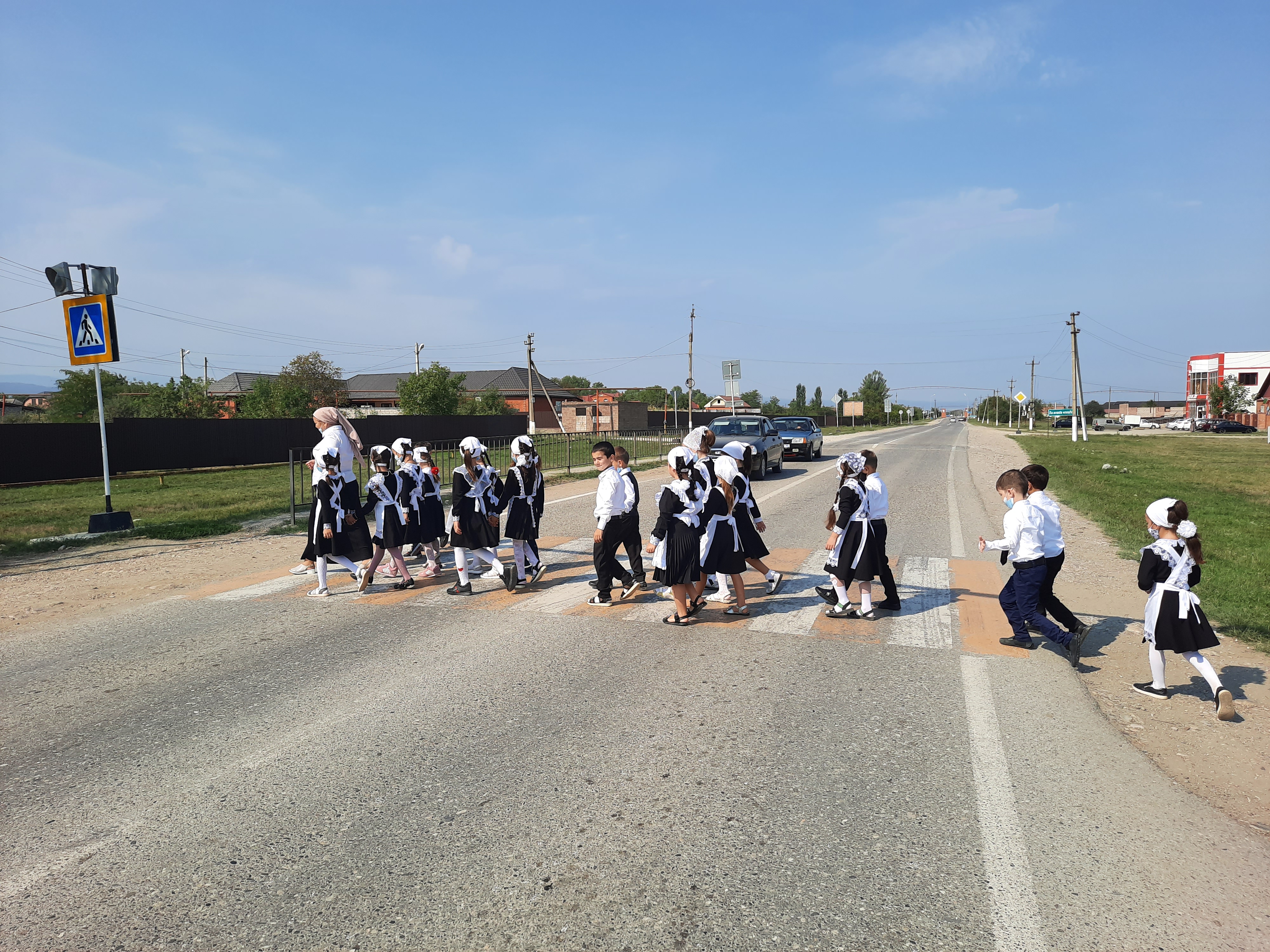 Наши первоклассники вместе со своим учителем учат правила дорожного движения.