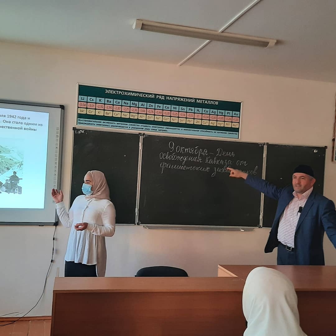 Сегодня учитель истории М.А. Багаева и учитель ОБЖ Бачаев И.В. провели Урок мужества,посвящённый дню освобождения Кавказа от фашистских захватчиков.