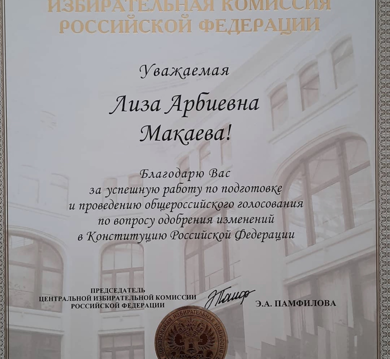 Об объявлении благодарности Председателя Центральной избирательной комиссии РФ.