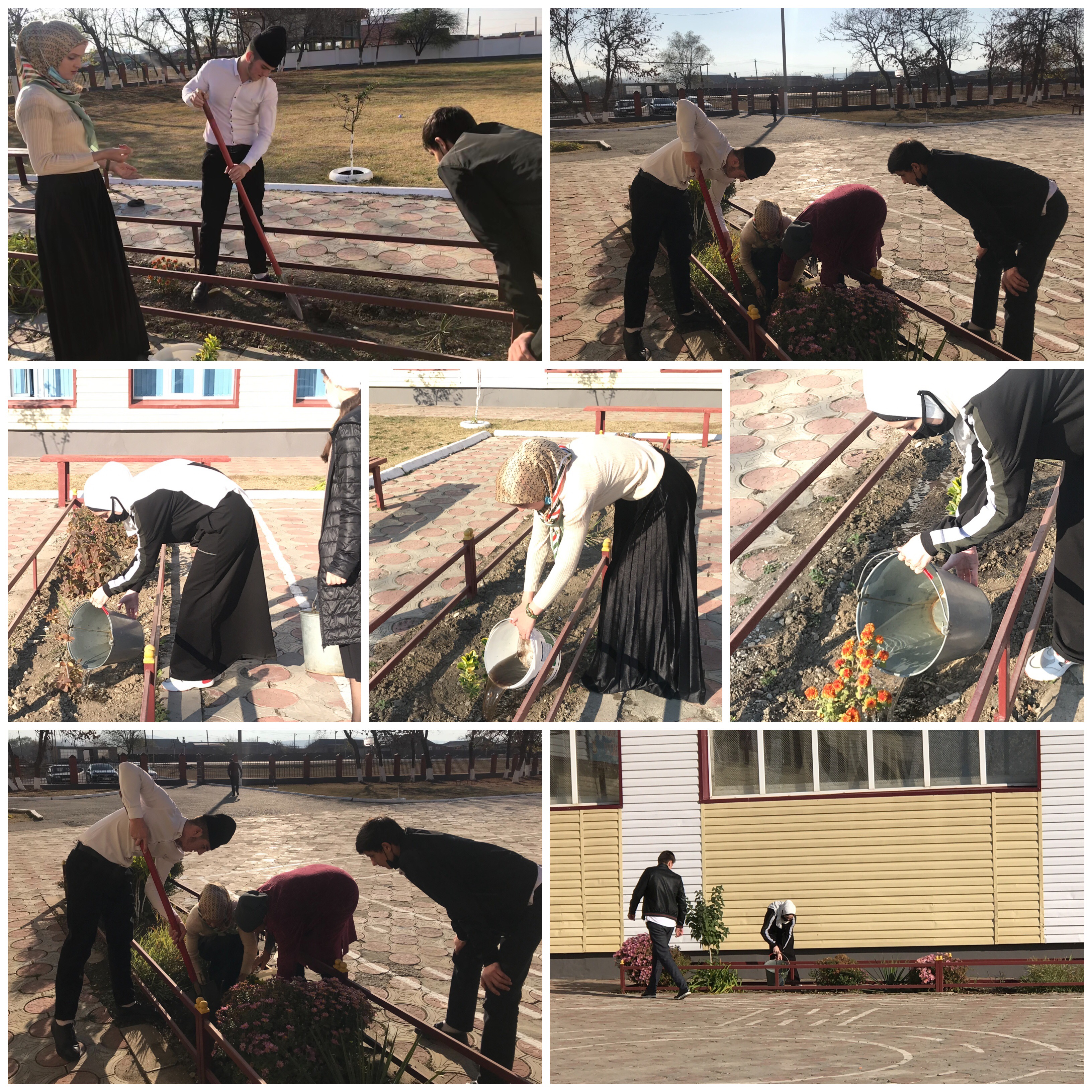 Члены школьной ЕДЮО "Юные Кадыровцы" во главе с директором школы М.Д.Идиговой провели сегодня работу по облагораживанию школьной территории. Были очищены клумбы и посажены цветы и декоративные кустарники.