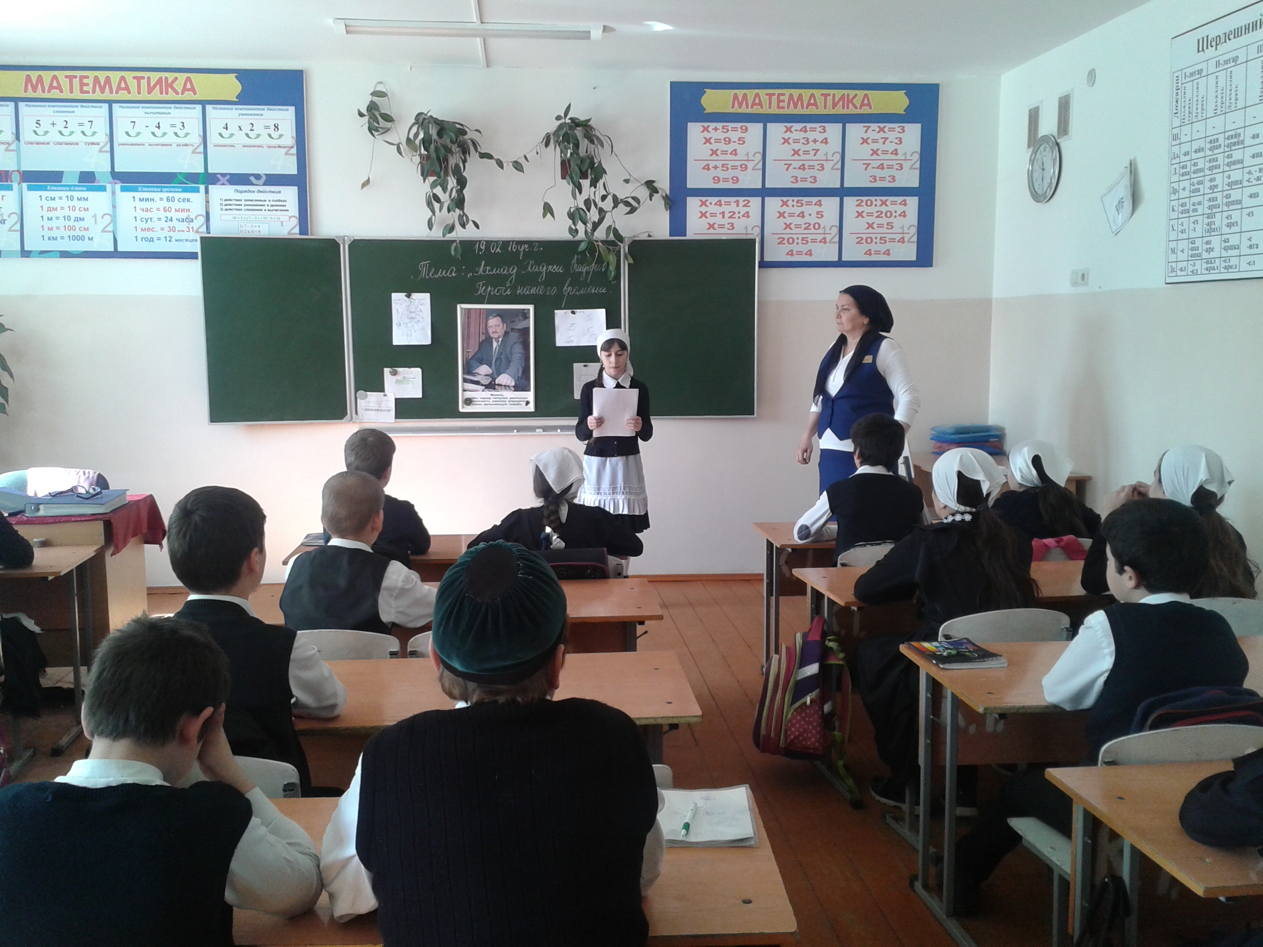 А-Х. А. Кадырова. Согласно заранее составленному плану проведены: субботник по очистке школьного двора и прилегающей территории, общешкольная тематическая линейка, круглый стол «Не может не вызвать уважения народ, у которого такие сыновья», организовано чтение мовлида, оформлен фасад здания, обновлены тематические стенды.