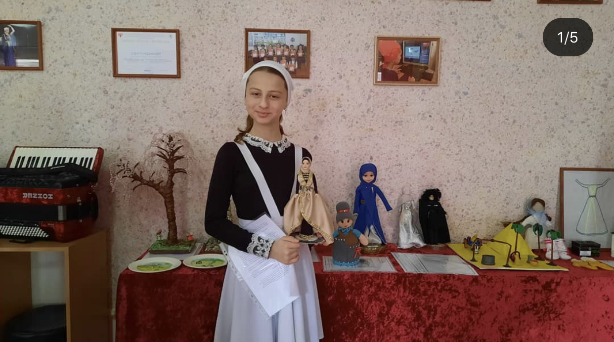 Ученица 5 класса представляет свою работу в номинации "Чеченский национальный костюм" на районном этапе Всероссийского конкурса "Наследники традиций"