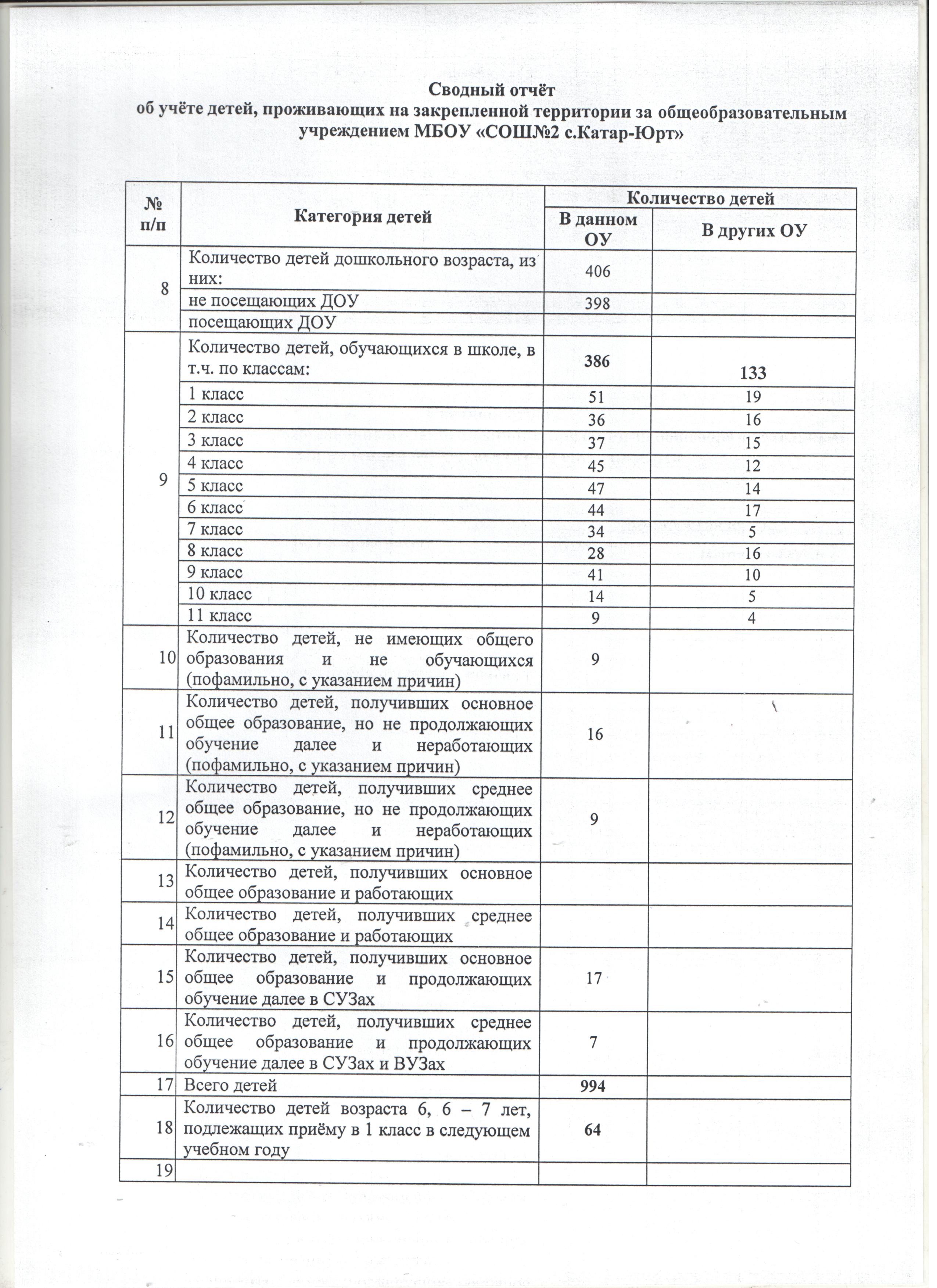 Сводный отчет. об учете детей проживающих на закрепленной территории за общеобразовательным учреждением в МБОУ СОШ № 2 с. Катар-Юрт