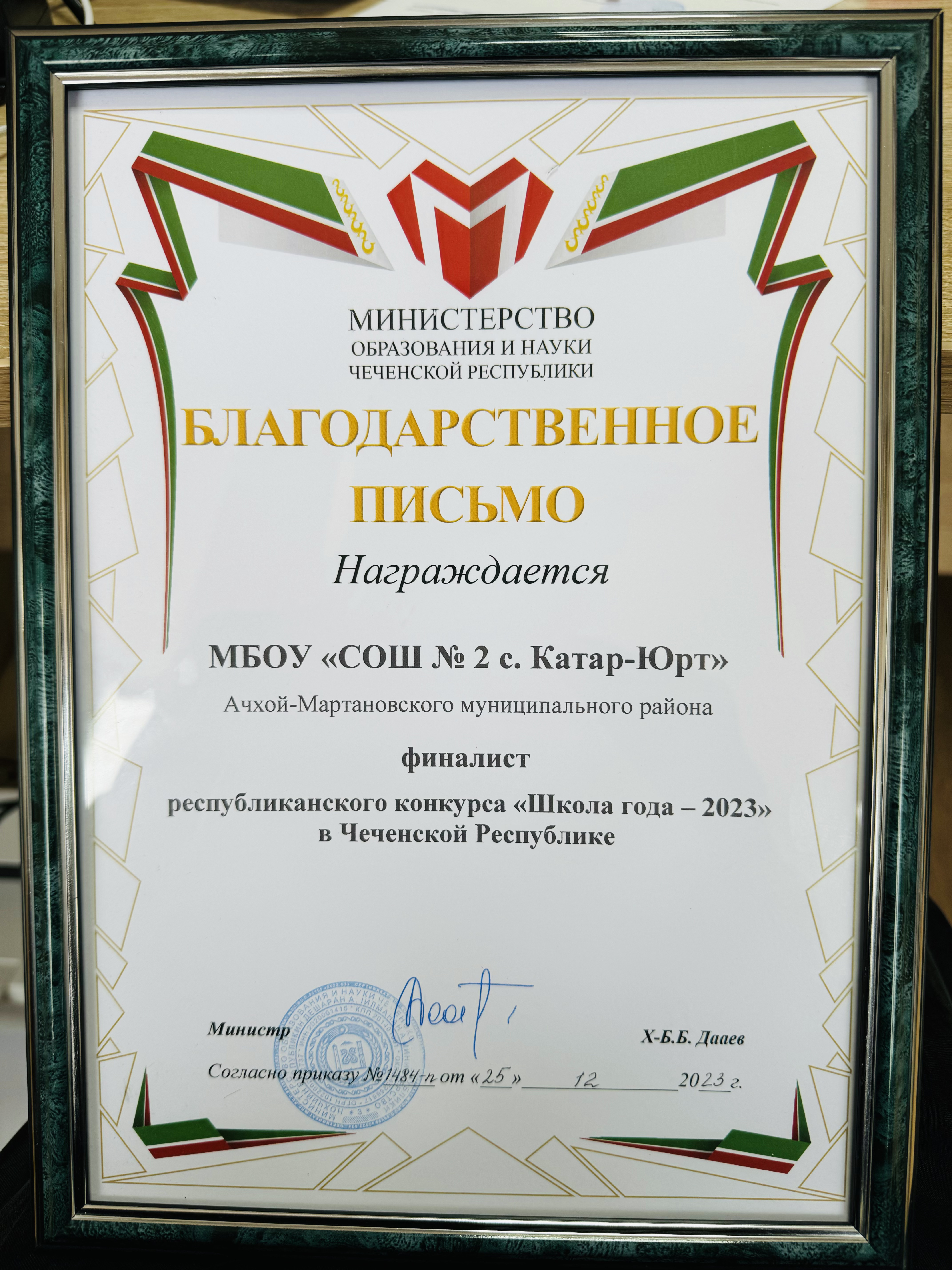 Благодарственное письмо от министра образования и науки Чеченской Республики Дааева Х-Б.Б. 👏🏻