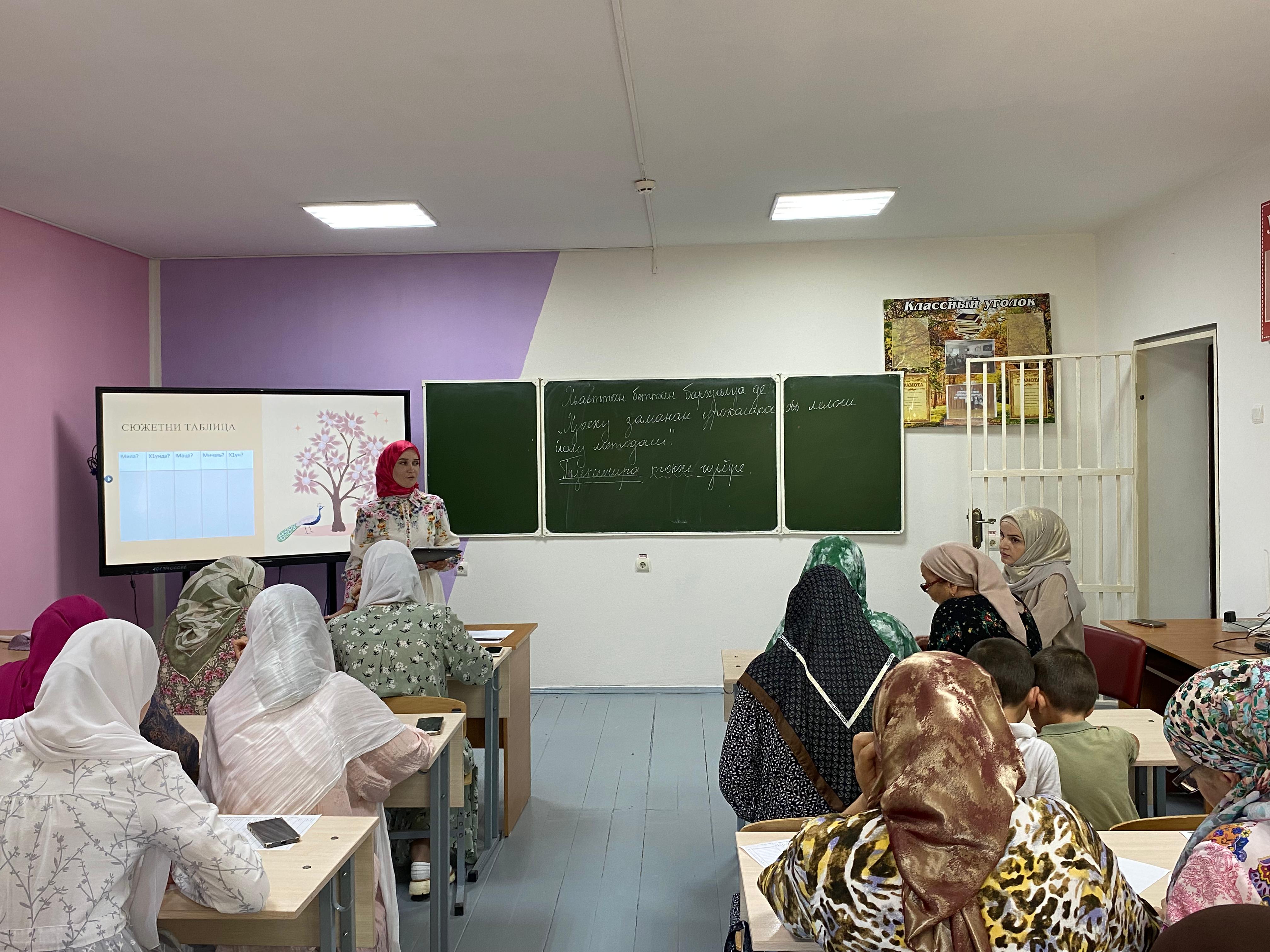 Для более продуктивной работы в новом учебном году, в соответствии с планом работы школы с начала августа в школе учителями-предметниками проводятся семинары и открытые уроки для педагогического коллектива школы. Первый семинар ' Методы современного урока" провела учитель чеченского языка и литературы Х.У.Накаева.