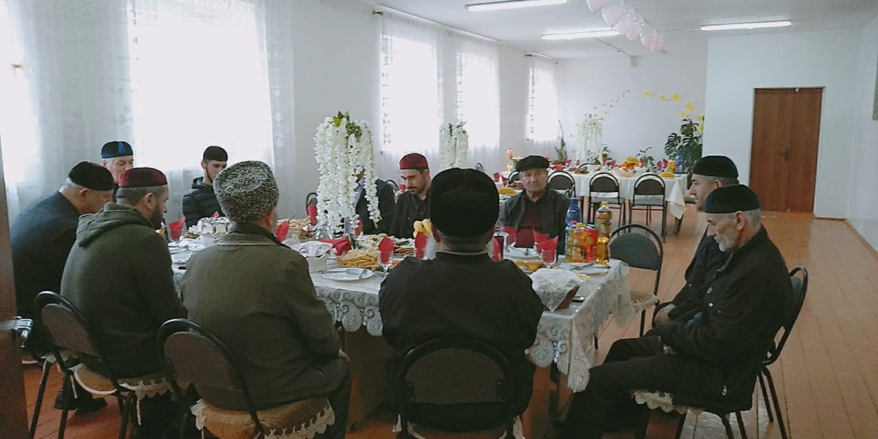По окончании торжественной части общешкольного мероприятия, посвященного Дню чеченского языка, гости были приглашены к праздничному столу. Имам села с. Катар-Юрт Адаев А. прочитал Мовлид.